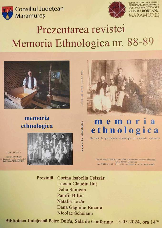 Centrul Județean pentru Conservarea și Promovarea Culturii Tradiționale „Liviu Borlan” Maramureș în parteneriat cu Biblioteca Judeţeană „Petre Dulfu” Baia Mare organizează prezentarea revistei „Memoria ethnologica”, nr 88-89.