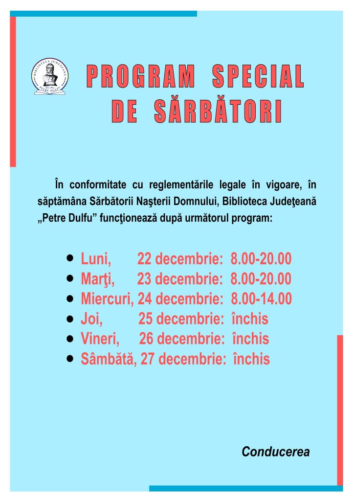 Biblioteca Județeană „Petre Dulfu” funcționează după următorul program: