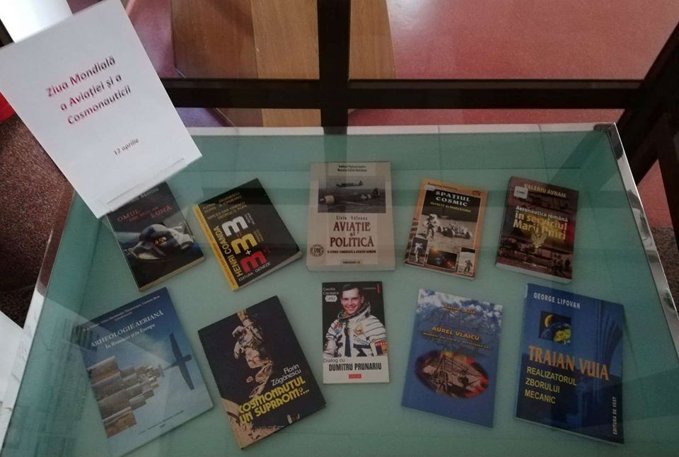 Vitrina de carte, la Sala de lectură „Gheorghe Pop de Băsești”. 12 aprilie 1961: Zborul primului cosmonaut din lume, Iuri Gagarin, la bordul navei „Vostok I”.