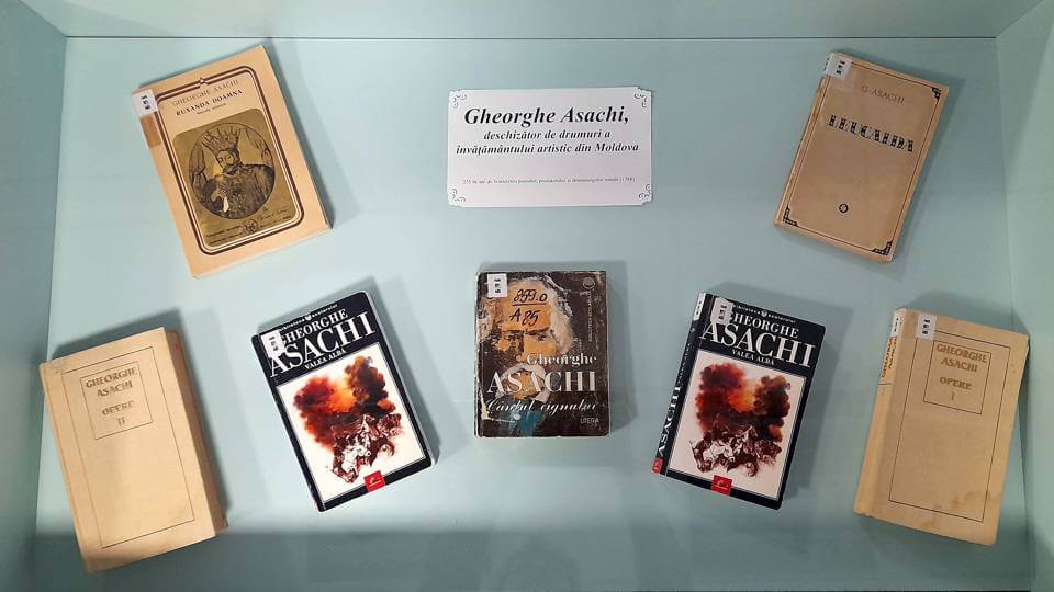 Gheorghe Asachi s-a născut în 1 martie 1788, la Herţa, în Moldova de Sus. A absolvit cursurile de filologie, filosofie şi construcţii civile ale Universităţii din Lown, unde a obţinut şi „gradul de doctor în filosofie. Mihail Kogălniceanu în Dacia literară, scria despre Asachi: „D.aga Gh. Asachi este bărbatul acela care în vremi grele s-au străduit pentru luminarea neamului său. D-lui este acel carele pentru literatura Moldaviii au făcut singur mai mult decât toţi moldovenii împreună” (p.280). Vitrină de carte la Biblioteca Judeţeană „Petre Dulfu” Baia Mare.