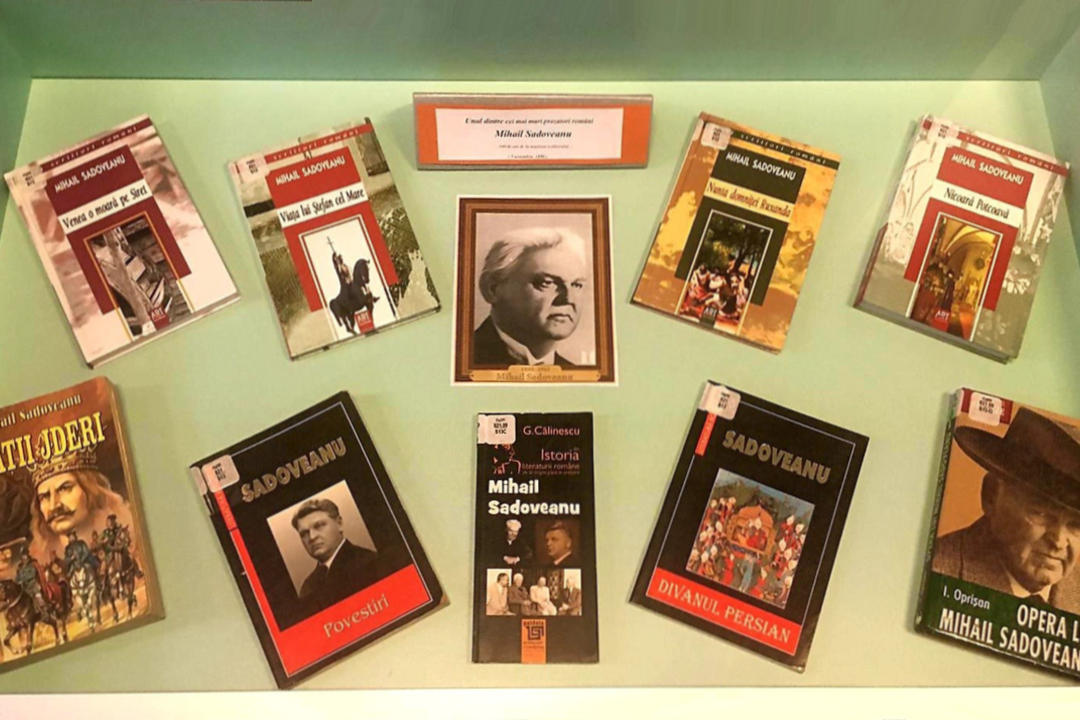 Mihail Sadoveanu s-a născut la 5 noiembrie 1880 la Paşcani trecând în eternitate la 19 octombrie 1961. A debutat cu schiţa „Domnişoara M…din Fălticeni” în anul 1897, iar în 1904 are loc debutul editorial cu patru volume: „Povestiri”, „Şoimii”, „Dureri înăbuşite” şi „Crâşma lui Moş Precu”. Nicolae Iorga a numit anul 1904 „anul Sadoveanu”. A colaborat la cele mai importante reviste literare. A fost preşedinte de onoare al Uniunii Scriitorilor, membru al Academiei Române remarcându-se şi în viaţa politică fiind membru şi apoi vicepreşedinte al prezidiului Marii Adunări Naţionale. A obţinut Medalia de aur a Păcii (1950). A publicat aproape o sută de volume fiind „cel mai iubit şi mai iubit dintre nuveliştii” vremii sale. A scris romane de actualitate, dar cele mai apreciate au fost romanele istorice şi povestirile, multe dintre ele marcând momente esenţiale în istoria literaturii române: „Hanu Ancuţei”, „Împărăţia apelor”, „Zodia Cancerului sau vremea Ducăi-Vodă”, „Fraţii Jderi”, „Baltagul”, „Ostrovul lupilor”, „Neamul Şoimăreştilor” etc. A fost unul din cei mai prolifici scriitori ai literaturii române, scrierile inspirate din lumea satului, din frumuseţile naturii şi cele din istoria poporului român sunt citite şi azi cu plăcere. Vitrina de carte la Biblioteca Judeţeană „Petre Dulfu” Baia Mare