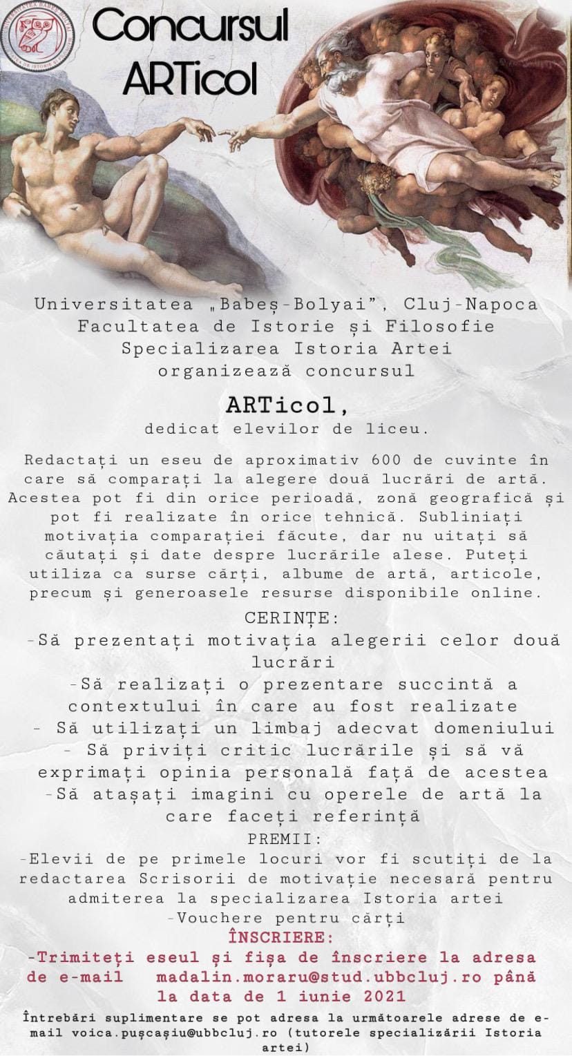 Specializarea Istoria artei a Facultății de Istorie și Filosofie de la Universitatea „Babeș-Bolyai”, Cluj-Napoca vă invită la concursul ARTicol!