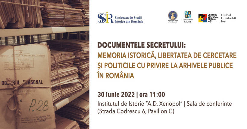 Societatea de Studii Istorice din România (SSIR) și Institutul de Istorie „A.D. Xenopol” organizează, joi, 30 iunie 2022, orele 11:00 – 13:00, în format mixt (fizic şi on-line), masa rotundă „Documentele secretului: Memoria istorică, libertatea de cercetare și politicile cu privire la arhivele publice în România”.