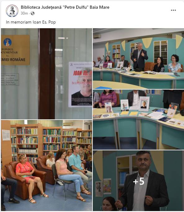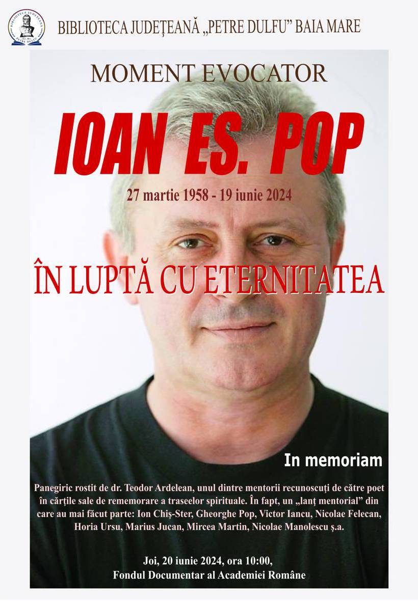 Colectivul Bibliotecii Județene „Petre Dulfu” l-a evocat, astăzi, la Fondul Documentar al Academiei Române, în prezența prof. Ioan Marian Pop, director al Școlii Gimnaziale „Avram Iancu” Baia Mare și văr al poetului, Olimpia Ghețe și Mariana Chiș, din Vărai, locul pe care poetul l-a numit „satul cu nume de paradis scufundat”, Săluc Horvat, care l-a cunoscut pe studentul Ioan Es. Pop și a urmărit îndeaproape devenirea lui poetică de la debut până la statutul de mare poet contemporan.