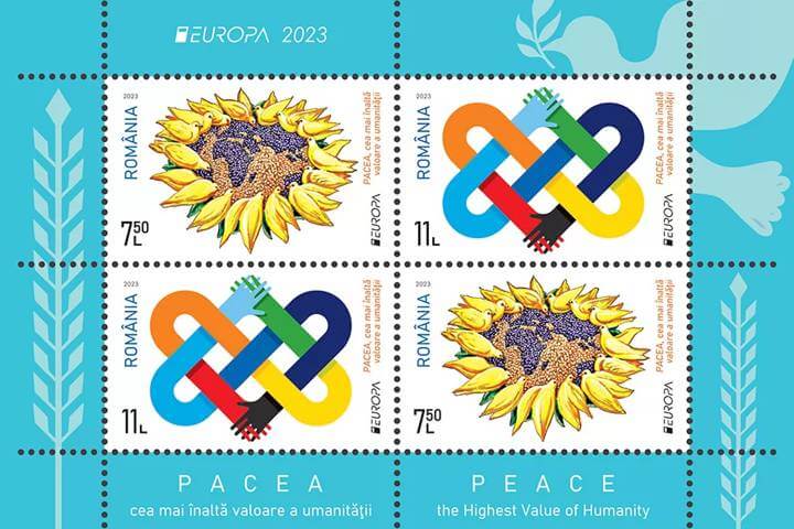 În data de 9 mai 2023, Romfilatelia a lansat o nouă emisiune de timbre, denumită „EUROPA 2023 – PACEA, cea mai înaltă valoare a umanității” (LP #2416) cu scopul de a promova instaurarea păcii, prieteniei dintre națiuni și toleranței. Această tematică a fost stabilită de PostEurop, care a considerat că în contextul actual al agresiunilor și războaielor din lume, pacea este cel mai important dar pentru omenire. Design-ul câștigător al concursului organizat de PostEurop a fost realizat de Linda Bos și Runa Egilsdottir din Administrația Poștală din Luxemburg și reprezintă o metaforă vizuală a unei societăți integrate pașnic, în care oamenii se îmbrățișează reciproc. Design-ul se inspiră din simbolul Celtic Love Knot și reprezintă o paletă de culori care ilustrează toate națiunile din lume, cu adăugarea de mâini cu degete împletite pentru a transmite mesajul respectului reciproc.