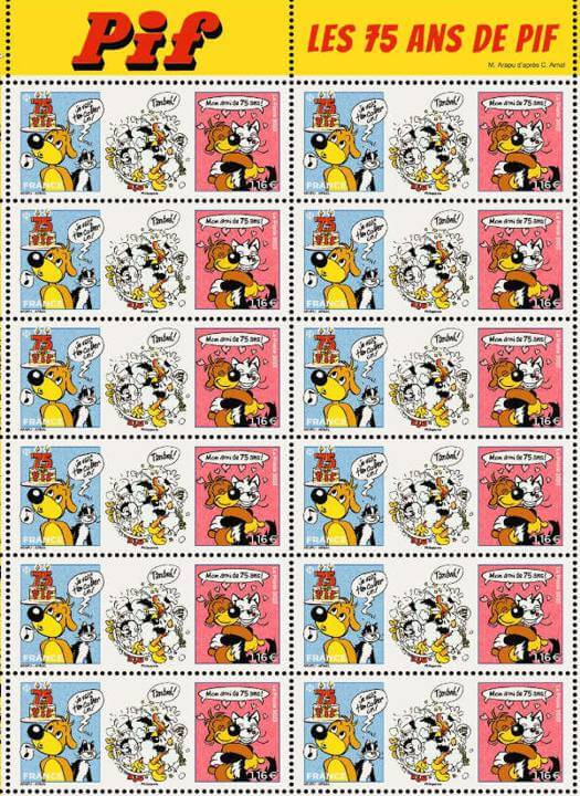 Pif, celebrul câine din benzile desenate franceze, a împlinit 75 de ani. Cu ocazia aniversării sale, a fost lansat un nou timbru poștal în cadrul Salonului de Filatelie de Primăvară. Timbrul (60 x 25 mm) a fost distribuit în magazinele specializate începând cu 27 martie 2023 și costă 1,16 euro. Tirajul emisiunii a fost de 705.000 exemplare paginate în 70.500 blocuri de câte 10 mărci poștale.