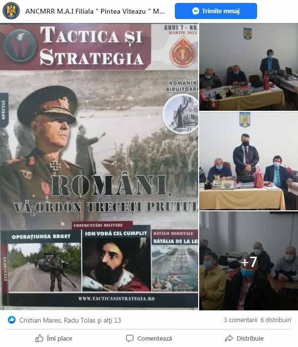 La data de 15 aprilie 2021, începând cu ora 10.00, la sediul Asociației Cadrelor Militare în Rezervă și în Retragere din M. A. I. – Filiala „Pintea Viteazu” Maramureș, a avut loc lansarea numărului 7 a revistei de istorie militară românească și internațională, denumită „Tactica și Strategia„, revistă editată sub egida Asociației Naționale Cultul Eroilor, „Regina Maria”.