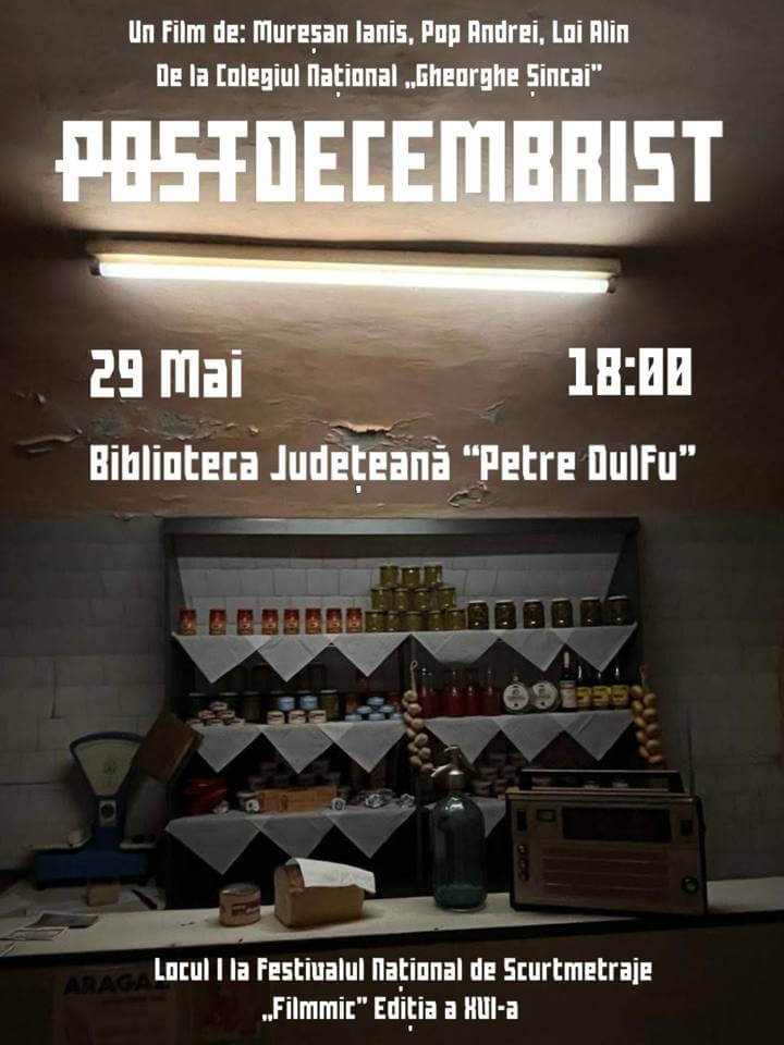 La Sala de conferințe a Bibliotecii Județene „Petre Dulfu” va avea loc proiecția scurtmetrajului ”Postdecembrist”, realizat de elevii Colegiului Național „Gheorghe Șincai” Baia Mare: Loi Alin, Pop Andrei, Mureșan Ianis, Șișeștean Andrei și Țolaș Teodora.
