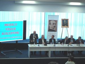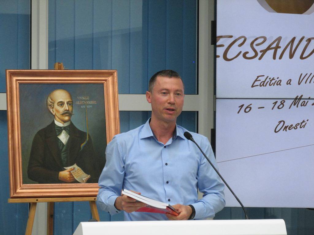 După prânz ne-am reunit la Biblioteca Municipală „Radu Rosetti”, de data aceasta în Sala multifuncţională, care beneficiază de lumină naturală prin tavanul de sticlă în stil futurist, având totuşi dezavantajul că se creează inconfortabilul efect de seră atunci când razele soarelui sunt mai puternice. Aici am avut parte de un moment poetic şi muzical, urmat de punctul culminant al sesiunii: prezentarea cărţii Activitatea lui Vasile Alecsandri pe tărâmul literaturii române, teza de doctorat a lui Petre Dulfu, publicată la Editura Bibliotecii Judeţene „Petre Dulfu” în anul 2006, urmând ca la Bacău să fie reeditată. Dr. Teodor Ardelean, directorul instituţiei editoare, şi-a început discursul prin prezentarea succintă a biografiei lui Petre Dulfu, marcată de descoperirea lumii cărţilor, printre care cea dintâi care i-a căzut în mâini a fost Doine şi lăcrămioare, semnată de Vasile Alecsandri. Ajuns student la Universitatea clujeană, unde a urmat Facultatea de Litere şi Filosofie, Petre Dulfu îl are printre profesori pe Grigore Silaşi, devenit academician şi prieten cu Vasile Alecsandri. Fost secretar şi preşedinte al Societăţii de lectură de la Liceul băimărean, astăzi numit „Gheorghe Şincai”, având o capacitate deosebită de asimilare a cunoştinţelor, studentul român Petre Dulfu, aminteşte vorbitorul, „ştia pe de rost deja volumele lui Vasile Alecsandri. S-a impus în faţa celorlalţi colegi şi, la terminarea facultăţii, a optat pentru a-şi da şi doctoratul, avându-l pe Silaşi drept conducător. […] Ştim că în vremea aceea s-a scris – şi aceasta este cartea (adică exemplarul de la biblioteca noastră, n.n.) – prima teză de doctorat despre Vasile Alecsandri, Activitatea lui Vasile Alecsandri pe tărâmul literaturii române, publicată în anul 1881 la Cluj. […] După tipărirea tezei, evident că era nevoie să fie informat și creatorul, autorul Vasile Alecsandri. […] Finalitatea corespondenței dintre Grigore Silași și Vasile Alecsandri a fost că Grigore Silași i-a spus lui Alecsandri că trebuie să se bucure pentru ce a scris [Petre Dulfu]”.