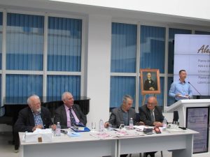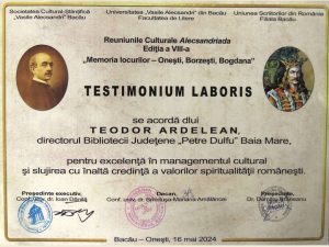 Profesorul Dănilă a venit cu câteva completări și explicații, respectiv că ediția a doua a cărții lui Petre Dulfu, gândită și planificată să apară la Editura Vasile Alecsandri din Bacău: „În clipa de față sunt doar două exemplare apărute: unul la domnul director și altul aici. De ce? Fiindcă am revizuit conținutul și m-am întâlnit la un moment dat cu o situație din care n-am putut ieși. Acum însă, tot cu ajutorul Bibliotecii de la Baia Mare, am găsit ieșirea. Prin urmare, fie Ana-Maria Brezovszki, fie Petre Dulfu, unul dintre cei doi, a «povestit» poezia lui Vasile Alecsandri. Așadar, versurile lui Alecsandri nu sunt incluse în versificația clasică, știută, cea din ediția princeps, ci au fost trecute într-un fel de proză. Întrebarea este cine le-a povestit: Ana-Maria Brezovszki, traducătoarea, sau Petre Dulfu, în teza lui de doctorat? Rămâne să stabilim. Acum mă bucur că avem originalul, scanat, al acestui exemplar din 1881, și îi vom da drumul la tirajul lung”. După care l-a gratulat pe directorul Teodor Ardelean cu un braț de cărți și distincții, la care a plusat și Dumitru Brăneanu, cu o carte a lui George Bacovia numită Stanțe burgheze. „Ați putut vedea și dumneavoastră – a adăugat universitarul băcăuan – ce om extraordinar este domnul Teodor Ardelean, așa încât i-am pregătit și noi un gest simbolic de recunoștință, în primul rând un «Testimonium laboris». Avem tot pentru dumnealui medalia – sunteți primul, domnule director, care o primeşte –, lansată astăzi, «Maria Bogdan», fiica lui Vasile Alecsandri, cu certificat de autenticitate. Și mai este ediţia Alecsandri din 2019, care trebuie neapărat să meargă la Baia Mare, în două volume, îngrijite de Eugen Simion, prietenul nostru. Și ultimul lucru, scos de la inimă (adică din buzunarul de la piept, n.n.), o medalie «Alecsandri și George Sion», pentru bicentenarul nașterii celui ce ne-a lăsat Limba românească. Felicitări din toată inima, domnule director!”