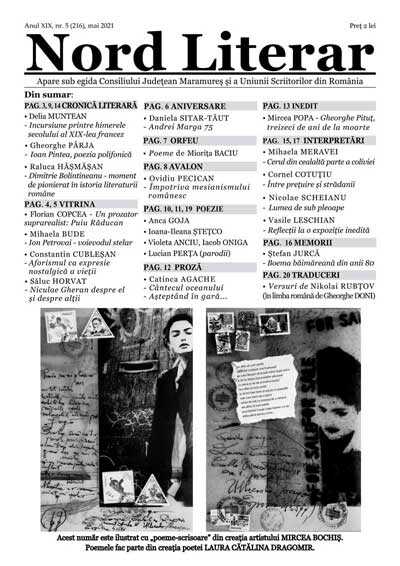 Cu volumul „Între real și imaginar. Incursiuni în proza fantastică franceză din secolul al XIX-lea” (2020), Gheorghe Glodeanu – teoretician profesionist al literaturii fantasticului – își extinde călătoria în beletristica genului, investigând narațiuni din literatura franceză. În cronica asupra acestei lucrări, Delia Muntean urmărește excursul teoretic, autorii și operele analizate. Săluc Horvat conturează cu pricepere portretul lui Niculae Gheran, după cum este surprins în volumul „La spartul târgului. Interviuri și 75 de dedicații de la Arghezi la Zub” (îngrijit de Rodica Lăzărescu). Daniela Sitar-Tăut semnează un amplu articol aniversar despre personalitatea lui Andrei Marga, la împlinirea vârstei de 75 de ani. În antologia „Față către față. Poeme alese (1992-2019)”, Gheorghe Pârja redescoperă discursul liric „polifonic”, armonios al lui Ioan Pintea. Antologia realizată de Delia Muntean „Dimitrie Bolintineanu. O sută și una de poezii” (Editura Academiei Române, 2020) îl readuce în atenție pe scriitorul pașoptist care a marcat un moment de pionierat în istoria literaturii române. Procedura de selecție a poemelor, judecățile teoretice și interpretările exegetice ale antologatoarei sunt expuse în cronica semnată de Raluca Hășmășan. Ovidiu Pecican continuă cercetarea despre Ion Petru Culianu în articolul „Împotriva mesianismului românesc”. Debutul Ancăi Goja în poezie e impresionant și merită atenția cititorilor. Alte pagini de versuri semnează Miorița Got, Ioana Ileana Ștețco, Violeta Anciu, Iacob Oniga, Lucian Perța (parodii). Despre Gheorghe Pituț la treizeci de ani de la moarte scrie Mircea Popa, oferind totodată spre publicare revistei băimărene aforisme inedite care i-au fost încredințate. Captivante sunt memoriile lui Ștefan Jurcă despre „Boema băimăreană din anii 80”. Proza scurtă („Cântecul oceanului”, „Așteptând în gară…”) este oferită de Catinca Agache. Citim versuri din creația lui Nikolai Rubțov, în traducerea lui Gheorghe Doni. Vasile Leschian face reflecții la o expoziție de pictură inedită. Alte recenzii semnează Constantin Cubleșan (despre discursul liric al lui Menuț Maximinian), Florian Copcea (despre „un prozator suprarealist: Puiu Răducanu”), Mihaela Bude (despre „Ion Petrovai – voievodul stelar”), Nicolae Scheianu (cu referire la volumul „Cerul din colivie” al poetei Nuța Crăciun). Numărul pe luna mai este ilustrat cu „poeme-scrisoare” din creația artistului Mircea Bochiș.