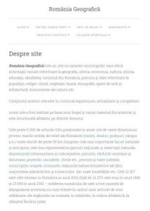 România Geografică este un site cu caracter enciclopedic care oferă informaţii variate referitoare la geografia, istoria, economia, cultura, ştiinţa, educaţia, sănătatea, turismul din România, precum şi date referitoare la populaţie, religie, climă, vegetaţie, faună, etnografie, opere de artă şi arhitectură, monumente ale naturii etc.