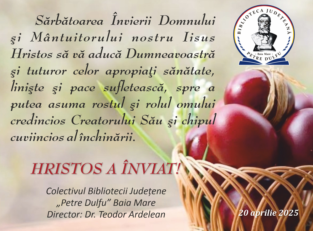 Sărbătoarea Învierii Domnului și Mântuitorului nostru Iisus Hristos să vă aducă Dumneavoastră și tuturor celor apropiați sănătate, liniște și pace sufletească, spre a putea asuma rostul omului credincios Creatorului Său și chipul cuviincios al închinării. Hristos a înviat! Colectivul Bibliotecii Județene „Petre Dulfu” Baia Mare Director dr. Teodor Ardelean Category: Știri19/04/2025 Share this post Share on FacebookShare on Facebook Share on XShare on X Pin itShare on Pinterest Share on LinkedInShare on LinkedIn Post navigationPreviousPrevious post:Recomandare de lectură de la Compartimentul „Multiculturalia”NextNext post:Citatul de duminică – 20 aprilie 2025Din aceeași categorieRevista „Nord Literar” – 270-27117/12/2025e-Acad, biblioteca digitală a Bibliotecii Academiei Române17/12/2025Simbolul iernii și bucuriei pe mărcile poștale – Jurnalul filatelic17/12/2025Anunț: Program special de sărbători16/12/2025Ne-a colindat Grupul Vocal Instrumental al Colegiului Tehnic „George Barițiu” Baia Mare16/12/2025Ziua Națională a României, sărbătorită de Consulatul României din Slatina, Ucraina16/12/2025