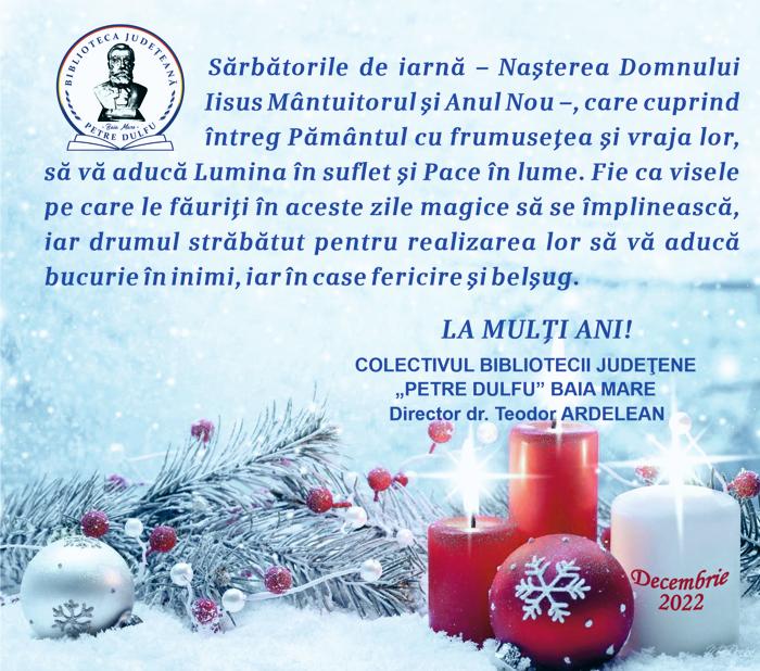 Sărbătorile de iarnă – Naşterea Domnului Iisus Mântuitorul şi Anul Nou -, care cuprind întreg Pământul cu frumuseţea şi vraja lor, să vă aducă Lumina în suflet şi Pace în lume.