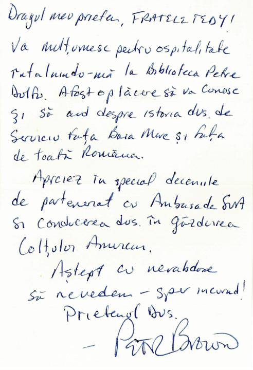 Vă mulțumim și noi, domnule Peter H. Brown! Vizita dumneavoastră ne-a onorat și ne-a confirmat importanța proiectelor desfășurate împreună!Colectivul Bibliotecii Județene „Petre Dulfu” Baia Mare