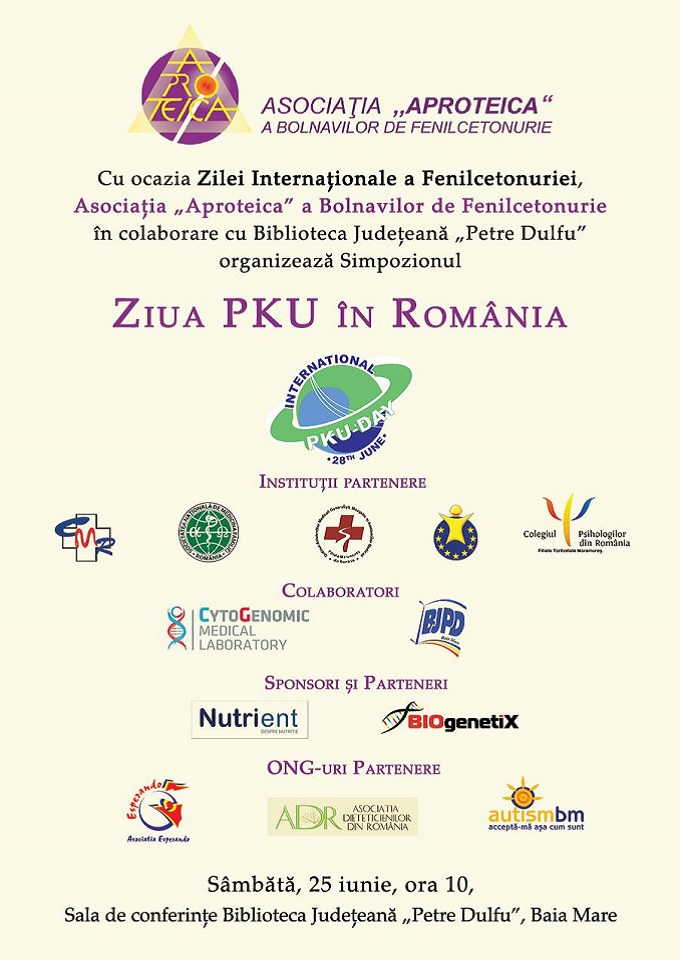 Cu ocazia Zilei Internaționale a Fenilcetonuriei, Asociația „Aproteica” a Bolnavilor de Fenilcetonurie în colaborare cu Biblioteca Județeană „Petre Dulfu” organizează Simpozionul „ZIUA PKU ÎN ROMÂNIA”.