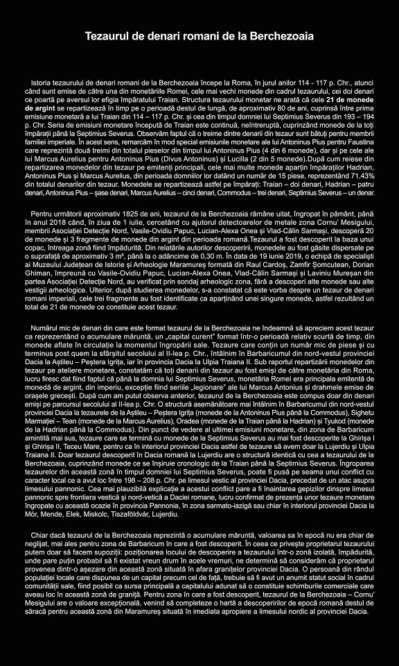 Invitați la deschiderea expoziției sunt autorii descoperirii acestui tezaur membrii Asociației Detecție Nord, Vasile-Ovidiu Papuc, Lucian-Alexa Onea și Vlad-Călin Sarmași. Tezaurul de denari romani de la Berchezoaia este cea mai recentă descoperire de acest gen pe teritoriul administrativ al județului Maramureș și urmează să fie expus vizitatorilor în premieră.