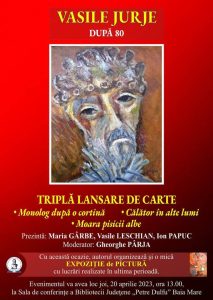 Biblioteca Județeană „Petre Dulfu” a organizat joi 20 aprilie, la Sala de conferințe, manifestarea „Vasile Jurje – După 80”, care a cuprins: o triplă lansare de carte a artistului plastic, precum și o expoziție de pictură cu lucrări realizate de artist în ultima perioadă.