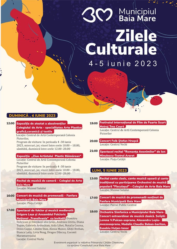Totodată, expoziția „Ziua Artistului Plastic Băimărean” vă va purta în lumea fascinantă a artelor plastice, fiind o oportunitate de a descoperi talentele locale. Aceasta poate fi vizitată la Centrul de Artă Contemporană de la Colonia Pictorilor, cu aceleași ore de vizitare menționate anterior. - Ora 16:00 – Colegiul de Arte Baia Mare vă invită la un recital de muzică de cameră, care are loc la Muzeul Satului. Veți putea savura sunetele îmbietoare și talentul tinerilor muzicieni.