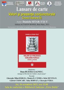 Consiliul Județean Maramureș în colaborare cu Revista de Cultură „Nord Literar”, Reprezentanța Maramureș a Uniunii Scriitorilor din România, Editura Acteon Books, Biblioteca Județeană „Petre Dulfu” și Asociația culturală „Arte perene” Rozavlea organizează lansarea cărții „Valori și prezențe conjucturale. Cronici literare (II)”, autor Daniela Sitar Tăut, apărută la Editura Acteon Books, Baia Mare, 2023.