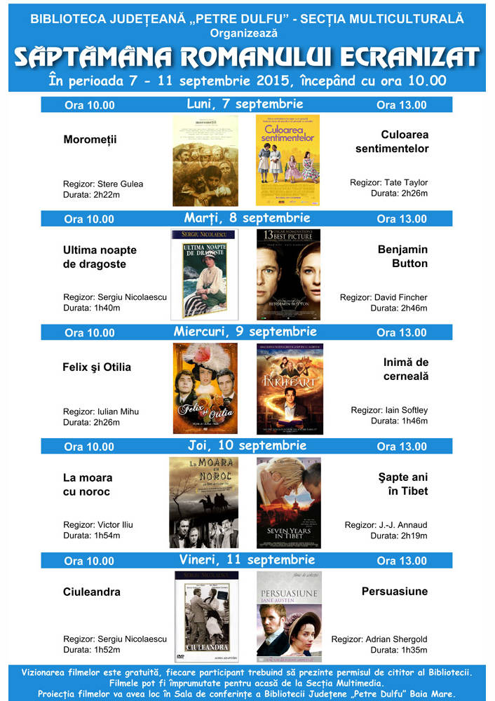 Biblioteca Judeţeană „Petre Dulfu”, Secţia multiculturală, organizează în perioada 7-11 septembrie 2015, începând cu ora 10, în Sala de conferinţe, programul cultural „Săptămâna romanului ecranizat„.