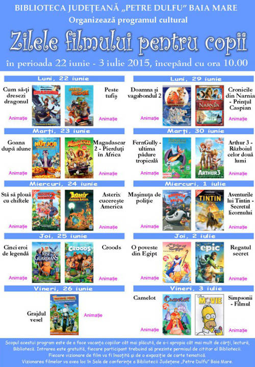 Biblioteca Judeţeană „Petre Dulfu”, Secţia pentru copii, organizează în perioada 22 iunie-03 iulie, 2015, începând cu orele 10:00 programul cultural: „Zilele filmului pentru copii„.